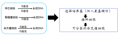 B淋巴细胞中这两种DNA的合成途径都有,而鼠骨髓瘤细胞中只有D途径。