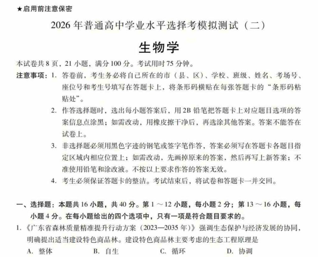 • 2026年4月广东省普通高考第二次模拟考试 生物学