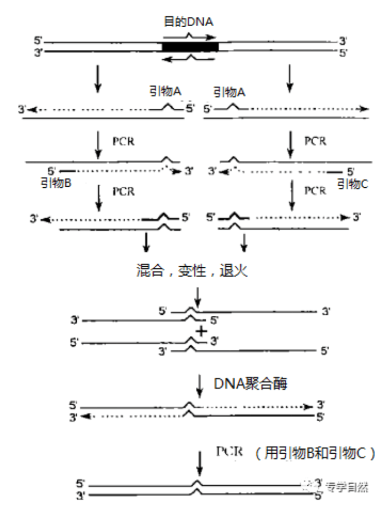 PCR 介导的定点突变一般需要 4 种引物,进行 3 次 PCR 反应。前两次 PCR 反应扩增形成两条双链 DNA 片段,这两条双链 DNA 片段经过变性和退火形成具有3’凹末端的异源双链分子,在 Taq 酶的作用下,产生含有重叠序列的双链 DNA 分子,再用两个外侧引物进行第三次 PCR 扩增,便产生突变体DNA,然后再构建表达载体进行表达[2]。