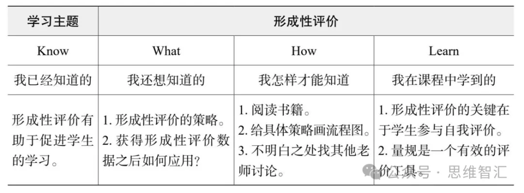KWHL策略也适用于教师的自我成长,下表呈现了一位教师在阅读形成性评价相关书籍时填写的KWHL记录表。带着疑问和思考读书,链接自己的已知与未知,读书的效果自然更好。