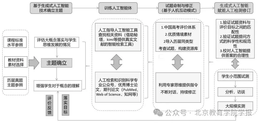 摘 要:在人工智能技术赋能的背景下,综合运用DeepSeek、Kimi、豆包、秘塔等多个人工智能技术平台,构建个性化智能体,通过基于生成式人工智能技术确立主题、训练人工智能体、基于目标预设的人机互动模式实现试题命制与修正、生成式人工智能赋能人工检测修订四个阶段,构建出基于生成式人工智能的试题命制路径,实现对学生评测试题的精细化设计。学生测试结果表明,生成式人工智能辅助能够使试题命制更加科学、精准、便捷,路径中的持续反馈机制有助于实现教学改进。