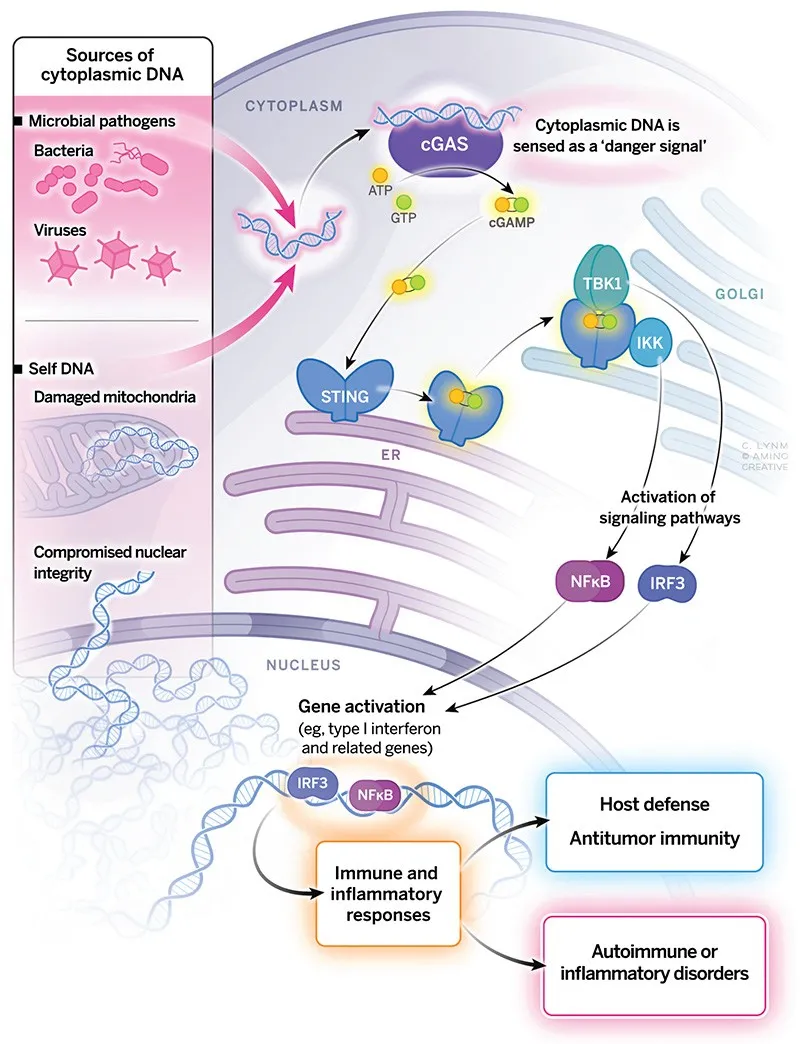 微生物入侵者或线粒体、细胞核的泄漏,会将 DNA 引入细胞质。一旦进入细胞质,DNA 就会与 cGAS 结合,从而促使 ATP 和 GTP 转化为 cGAMP。cGAMP 促使 STING 从内质网膜迁移到高尔基体,在那里激活 TBK1 和 IKK。随后的事件分别导致 IRF3 和 NF-κB 的激活。因此,IRF3 和 NF-κB 进入细胞核,激活编码促炎蛋白(包括 I 型干扰素)的基因,从而激发先天免疫系统。这一通路能够抵御危险的微生物和癌症,但也可能引发有害的自身免疫和炎症性疾病。