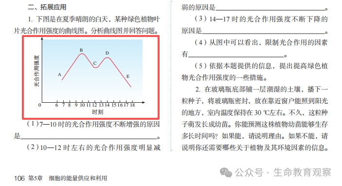高中生物学教材对于植物的光合作用的影响有多处提及,并且在课后练习里涉及了一道试题,涉及绿色植物叶片光合作用强度的曲线图,专门进行分析。可以说,这块内容是教学中的重点,也是命题的热点。