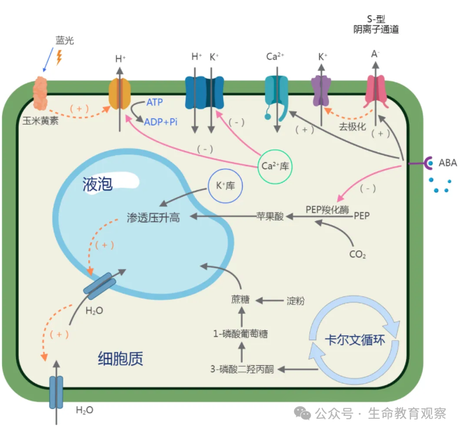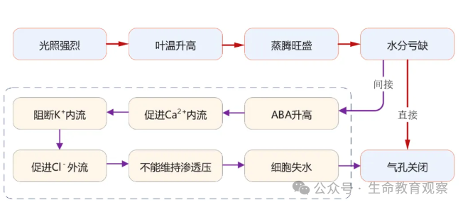 午休现象是植物在夏季正午高温、强光、低湿度环境下,为减少水分过度散失而关闭气孔的适应性反应。环境触发,高温与蒸腾胁迫夏季正午温度升高(通常>30℃)、空气湿度降低,导致叶片蒸腾作用加剧。若保卫细胞持续失水,会引发气孔关闭,以阻断水分进一步流失。生理响应,保卫细胞的水势变化与信号调控。高温下,保卫细胞膜上的K⁺通道(图 2 中紫色通道)开放,K⁺从细胞内流出;同时S – 型阴离子通道(图 2 中红色通道)释放阴离子(如苹果酸根)。离子外流使保卫细胞内渗透压降低,水势升高,水分外流,细胞皱缩,气孔关闭。