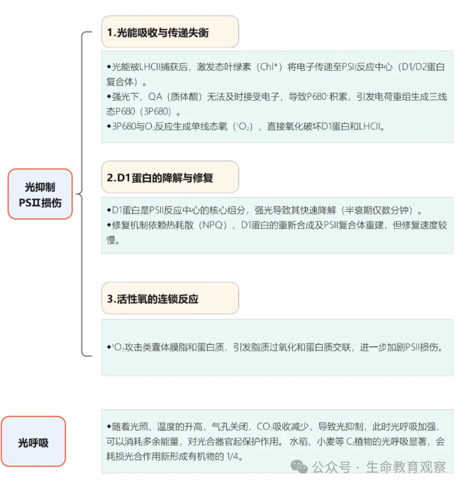 此外,午休现象还有非气孔因素。午休现象的非气孔因素主要包括光抑制和光呼吸增强:①强光引发光抑制,导致 PSII(光系统 Ⅱ)损伤,活性氧破坏光合结构,降低光合效率;②C₃植物(如水稻、小麦)光呼吸显著增强,消耗光合作用新形成有机物的 1/4,同时高温会钝化叶绿体酶、阻碍光合产物输出。