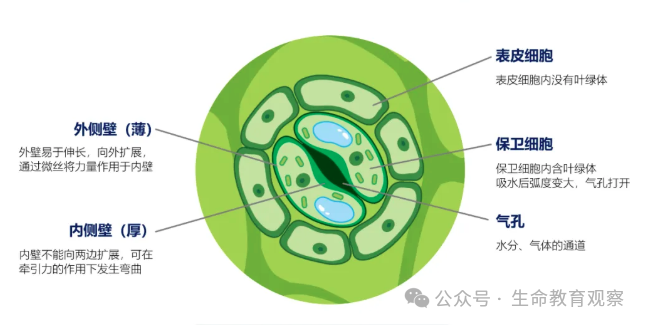 保卫细胞的形态与细胞壁差异。双子叶植物的保卫细胞多为肾形,靠近气孔一侧(内侧壁)的细胞壁厚且坚韧,远离气孔一侧(外侧壁)的细胞壁薄且有弹性。这种壁厚差使保卫细胞吸水时,外侧壁易伸长向外扩展,内侧壁因厚而弯曲,最终导致气孔张开;失水时则反向形变,气孔关闭。单子叶植物(如稻、麦)的保卫细胞为哑铃形,中间部分壁厚,两端壁薄,通过两端的胀缩控制气孔开闭。细胞内结构保卫细胞含有叶绿体,可进行光合作用合成糖类;同时具有液泡,通过液泡渗透压变化调控细胞吸水 / 失水。