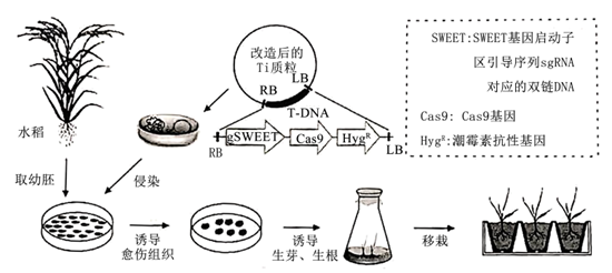 4.(2025年甘肃卷)21. 水稻白叶枯病(植株的叶片上会出现逐渐扩大的黄白色至枯白色病斑)由白叶枯病菌引起,严重威胁水稻生产和粮食安全。科学家利用CRISPR-Cas9基因组编辑技术,对水稻白叶枯病的感病基因SWEET(该基因被白叶枯病菌利用以侵染水稻)的启动子区进行了定点“修改”,编辑后的水稻幼胚通过植物组织培养技术获得抗病植株(如下图)。回答下列问题。
