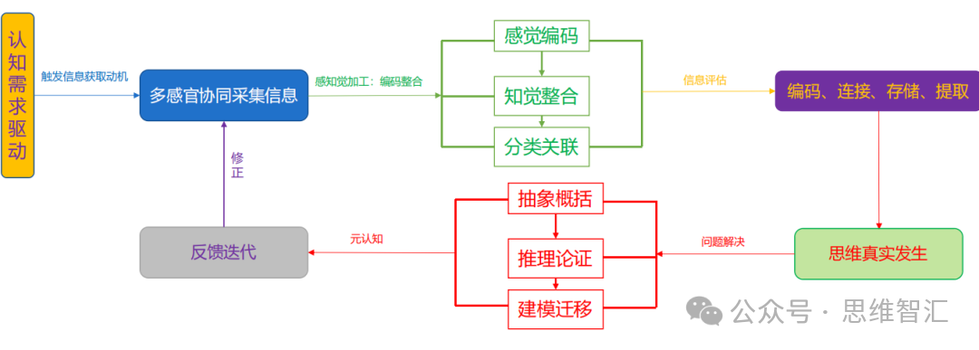 再对信息进行知觉统筹、编码连接、分类存储;进而通过抽象概括形成概念,通过判断推理开展思维活动,最终经元认知监控、反思与反馈实现思维迭代。