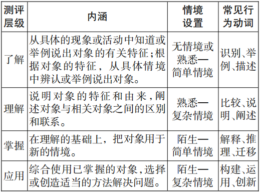 概念的测评层级可分为四级:了解、理解、掌握、应用。每一个层级都有其内涵,并且可以用相应的行为动词表示(见表 1),行为动词反映了相关概念测评的深度。一般情况下,当概念的测评为理解、掌握和应用层级时,可以将其作为生命观念发展水平的重要指标。