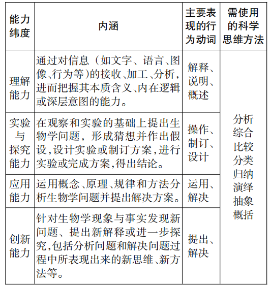 科学思维是方法和能力的统一体。科学思维方法主要是指逻辑思维方法,常见的逻辑思维方法有分析、综合、比较、分类、归纳、演绎、抽象、概括等,这些思维方法在使用时可以表现为技能,即思维技能。当思维技能在一定的情境中得到运用时,就是一种能力的表现。按照“认知活动的性质与功能”这一角度,可将科学思维能力分为理解能力、实验与探究能力、应用能力和创新能力,这四种能力也是生物学学科中的关键能力。从操作层面上看,测评科学思维的发展状况主要是测评科学思维方法的运用状况,同时也体现了关键能力的发展状况。表 2 阐述了关键能力和科学思维方法之间的关系。