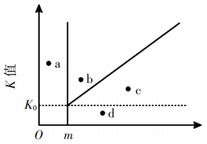 例 2,(2025,山东)种群延续所需要的最小种群密度为临界密度,只有大于临界密度,种群数量才能增加,最后会达到并维持在一个相对稳定的数量,即环境容纳量(K值)。不同环境条件下,同种动物种群的K 值不同。图中曲线上的点表示在不同环境条件下某动物种群的 K 值和达到 K值时的种群密度,其中 m 为该动物种群的临界密度,K0以下的环境表示该动物的灭绝环境。a、b、c、d 四个点表示不同环境条件下该动物的 4 个种群的 K 值及当前的种群密度,且 4 个种群所在区域面积相等,各种群所处环境稳定。不考虑迁入迁出,下列说法错误的是( )
