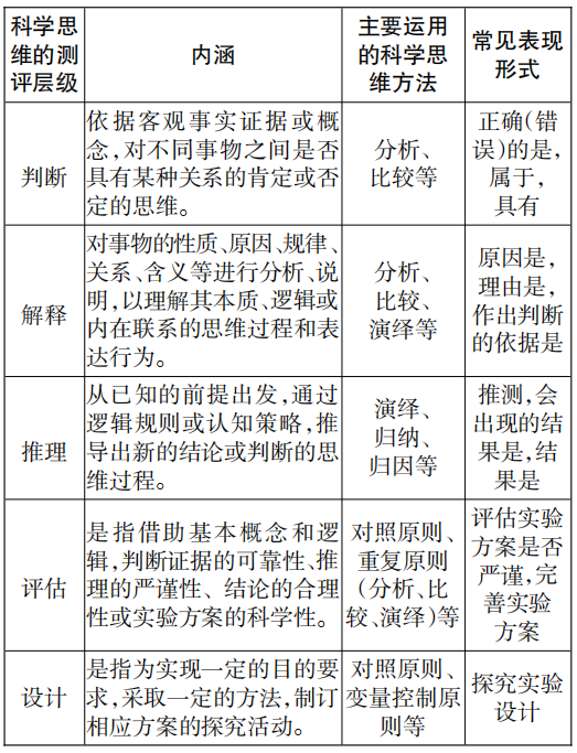 表3 科学思维的测评层次及需要用到的科学思维方法