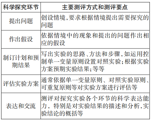 科学探究素养的测评主要包括提出问题、作出假设、制订计划和预期结果、评估实验方案、表达和交流等方面。由于纸笔测评无法评价科学探究的实际操作活动,因此着重测评科学探究中的思维活动。在上文科学思维的测评层次中,“评估”和“设计”都可以认为是测评科学探究的重要方面。测评探究实验的设计方案及预期实验结果,是现在生物学高考中测评科学探究的普遍形式。目前,单纯测评实验设计的试题也有一些,但大多数都是结合具体知识内容来测评。表 5 呈现了科学探究的测评环节及主要的测评方式和测评要点。