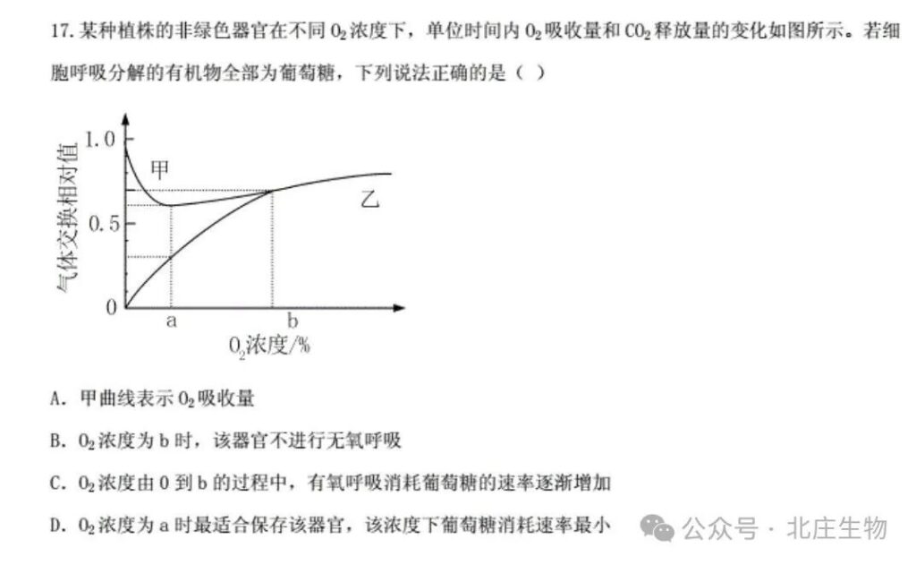 关键逻辑:单位CO₂释放量对应的葡萄糖消耗量不同——无氧呼吸的葡萄糖消耗效率是有氧呼吸的3倍(释放2mol CO₂消耗1mol葡萄糖,而有氧呼吸释放6mol CO₂才消耗1mol葡萄糖)。因此,当总CO₂释放量最低时,可能伴随无氧呼吸的增强,导致葡萄糖消耗总量增加。