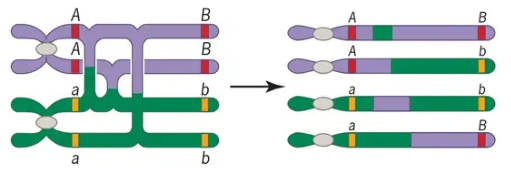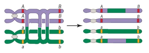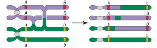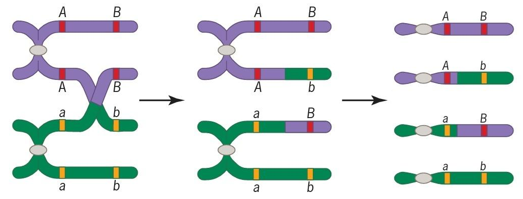 题意的理解:试题的已知就是一次交换(单交换)产生四种配子,两种亲本型(AB和ab),两种重组型(Ab和aB)。由于A(a)和B(b)在染色体两端,所以交叉点肯定它们之间。相当于如下图所示的单交换(图示来自于网络):