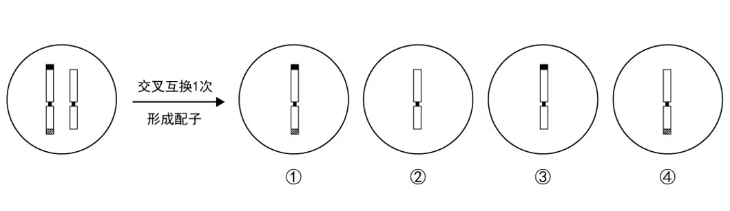试题:(网传2026年浙江首考20题)这是一对同源染色体,左边这条染色体上有2个来自非同源染色体的片段,该异常染色体交叉互换只形成一个交叉点(即进行单交换),下列说法错误的是( D )