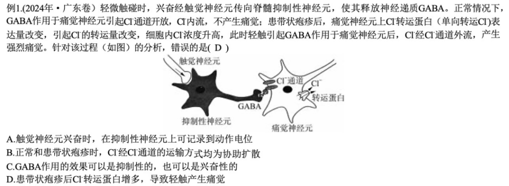 以轻触带状疱疹患者的患处为例,梳理Cl–外流引起动作电位的机制(图1)。在带状疱疹病毒的刺激下,机体痛觉神经元的细胞膜表面发生了变化,Cl–转运蛋白的表达量显著减少,Cl–外流减少,使痛觉神经细胞内Cl–浓度显著提高,且膜内外浓度发生逆转。当轻触带状疱疹患者患处时,兴奋传至抑制性神经元,分泌神经递质GABA,作用于患者的异常痛觉神经元,促进Cl–外流,进而产生动作电位,兴奋传至大脑皮层,从而使患者产生强烈痛觉。