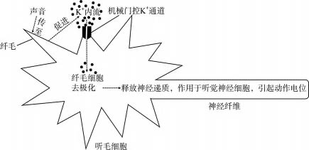 纤毛膜外(内淋巴)的K+浓度极高,约为150mM,Na+浓度很低,约为1mM,这种高钾、低钠的特性是内耳独特的离子组成,与一般的细胞外液(低钾高钠)明显不同,而是类似于细胞内液。纤毛膜内(毛细胞质)的K+浓度较高,但比内淋巴低,约为140mM,Na+浓度较低,约为10—15mM,这种离子分布与一般的细胞内液相似。因此在浓度上,纤毛膜外的K+浓度略高于纤毛膜内的K+浓度。跨膜K+浓度差异是听毛细胞感受机械刺激并产生兴奋的基础。当声音引起基底膜振动时,听毛细胞上的纤毛的运动打开机械门控K+通道。外部高浓度的K+(内淋巴)顺浓度梯度流入毛细胞内,导致纤毛细胞去极化,引发纤毛细胞释放神经递质,与听神经末梢沟通。听毛细胞K+内流产生动作电位的机制如图2所示。
