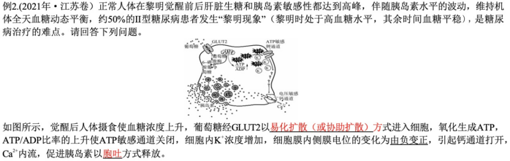 例2中产生胰岛素的胰岛B细胞,即属于腺细胞,同样可以在特定情况下产生动作电位。例如,在K+外流受阻时,胰岛B细胞可产生动作电位。由于ATP敏感K+通道关闭后,使K+外流受阻,胰岛B细胞膜内K+积累,导致膜电位去极化。去极化激活电压敏感Ca2+通道,Ca2+内流增加,引发胞内Ca2+浓度升高。Ca2+作为信号分子,促进胰岛B细胞内贮存胰岛素的囊泡与细胞膜的融合和释放,最终引发胰岛素分泌。此外,像低血钾症和轻度高血钾症患者也会因K+外流受阻,而导致心肌细胞的兴奋性增加。