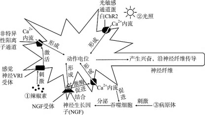 目前,Ca2+内流产生动作电位的机制(图3),主要有以下科研实例:①2021年诺贝尔医学或生理学奖所揭示了辣的产生机制。当辣椒素与人体感觉神经上的VRI受体结合后,非特异性阳离子通道被激活,Ca2+顺浓度梯度内流,形成动作电位,并将神经冲动沿感觉神经纤维传递至中枢,产生痒觉或痛觉。②光敏感通道蛋白ChR2是一种受特定波长光照控制的非特异性阳离子通道。当光照刺激ChR2时,细胞外Ca2+大量内流,产生光电流并形成动作电位。③在病原体刺激下,吞噬细胞分泌神经生长因子(NGF),NGF与感受器上的受体结合,引发感受器电位变化,并产生激酶促进Ca2+内流,Ca2+内流又能促进吞噬细胞分泌NGF,同时在感受器膜形成动作电位,进一步产生兴奋并传递痛觉。