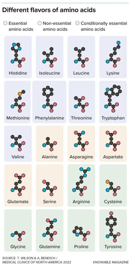 【图注:Different flavors of amino acids多种多样的氨基酸 Essential amino acids必需氨基酸,Non-essential amino acids非必需氨基酸,Conditionally essential amino acids条件必需氨基酸Histidine组氨酸,Isoleucine异亮氨酸,Leucine亮氨酸,Lysine赖氨酸 Methionine甲硫氨酸,Phenylalanine苯丙氨酸,Threonine苏氨酸,Tryptophan色氨酸Valine缬氨酸,Alanine丙氨酸,Asparagine天冬酰胺,Aspartate天冬氨酸 Glutamate谷氨酸,Serine丝氨酸,Arginine精氨酸,Cysteine半胱氨酸 Glycine甘氨酸,Glutamine谷氨酰胺,Proline脯氨酸,Tyrosine酪氨酸】图片来源:T·威尔逊&A·本迪奇(T. WILSON & A. BENDICH)/《北美医学临床》2022年,KNOWABLE MAGAZINE