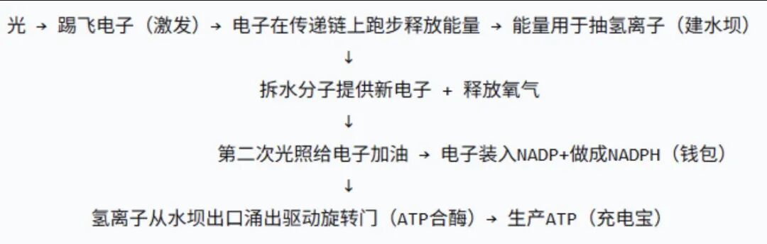- “最后,这个被二次助推的电子,带着最后的能量,冲过终点线,跳进一个叫 ‘NADP⁺’ 的等待分子怀里。”