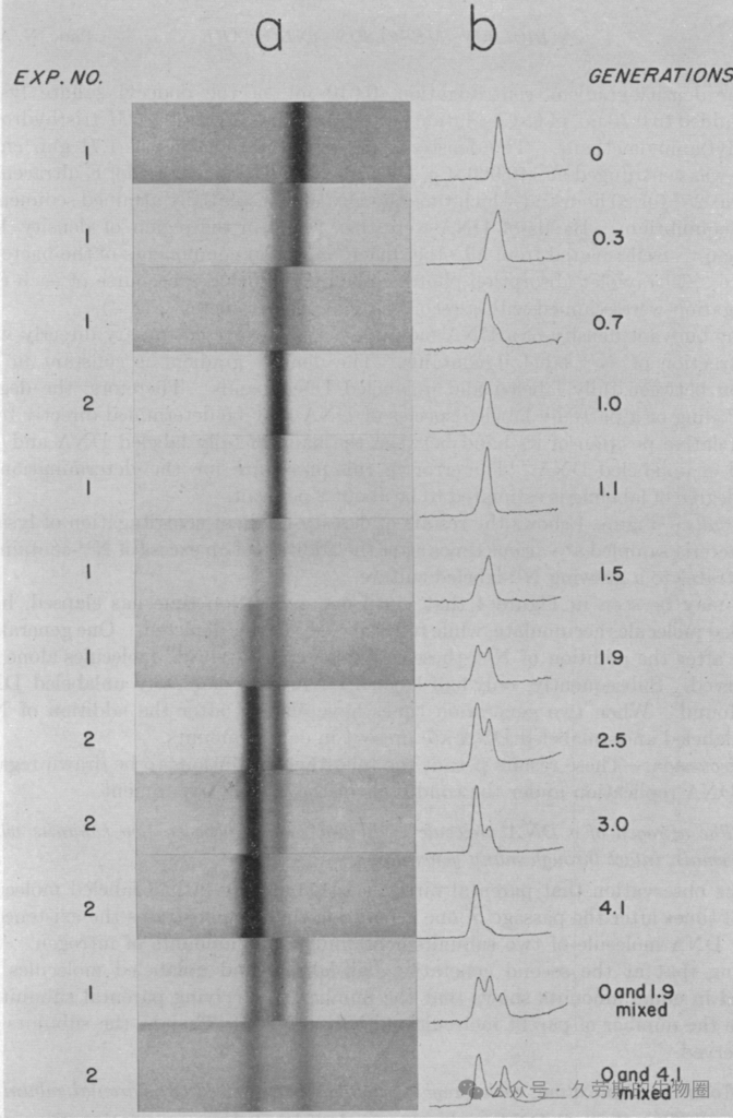 当将长期在¹⁵N培养基中培养的细菌转移到¹⁴N培养基中,并让其生长大约一个世代的时间后,对DNA进行分析,得到了一个决定性结果。离心图像显示,此时所有的DNA形成 单一的一条条带,而这条带的位置既不在原先重DNA的位置,也不在轻DNA的位置,而是精确地位于两者正中间。