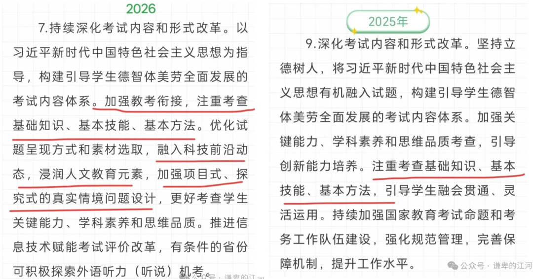 别看这几年的风向是在强调,为了匹配国家战略和产业发展需求,国家资源要大力向理工医农这些学科倾斜,但传统被我们归入文科的阅读理解,仍然是重中之重。文理界限在模糊,阅读能力成了所有学科的底层能力。既然强调考题“项目式”“探究式””真实情景“,一道题可能包含一个完整的项目背景,涉及多学科知识,需要孩子在考场上迅速读懂、分析、综合判断。我查了一个数据,跟2020年相比,2025年的数学试卷,题干的字数增加了一倍。阅读能力不达标,根本读不完卷面上那么多文字。文件中关于“考试内容和形式改革”的表述。我们把2026年和2025年相关表述进行对比: