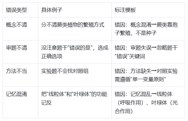 计算失误题:生物里的简单计算(如基因概率、生态系统能量流动),因粗心算错的,只需在原题旁标注,不用抄进错题本。