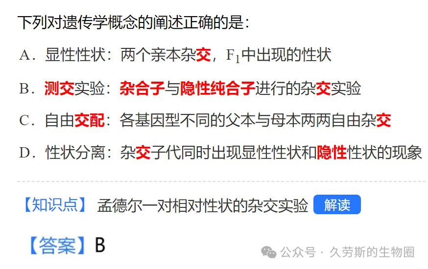 从考试导向来看,这是题型反馈的强化结果。在高中阶段的遗传学试题中,测交几乎总是以“已知杂合子求测交后代比例”或“已知测交后代1:1求亲本基因型”的形式出现。高频出现的题型反向强化了认知定势:提到测交,就联想到杂合子和1:1。