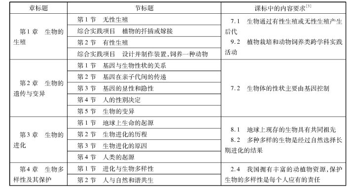 新教材的内容安排遵循学科知识的内在逻辑。生殖和遗传都属于生命的基本特征。生物代代繁衍,生生不息,遗传与变异伴随其间。假如把时间尺度拉长,就会看到进化的壮丽篇章:有的物种出现了,有的物种灭绝了,如今自然界中多种多样的生物正是进化的结果。生物多样性对人类的生存和发展具有重要意义,人们应当用恰当的方法保护生物多样性。循着这样的逻辑,第6单元依次安排了“生物的生殖”“生物的遗传与变异”“生物的进化”“生物多样性及其保护”4章内容。新教材的内容安排还考虑了学生的心理逻辑。例如,先学习不同的生物类群、生物分类、遗传与变异、生态系统的相关知识,再学习生物多样性内涵的3个层次,更符合学生的认知逻辑。各章节与课标内容要求的对应情况见表1,表中所列概念为二级概念(重要概念)。