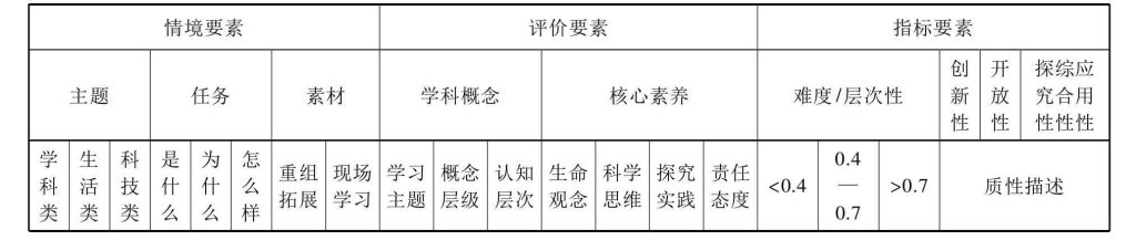 试题评价内容应呈现跨知识、认知到素养的梯度。同时,科学学科教学的使命不仅在于传授学科大概念,更要通过概念内化促进学生学科素养的发展。因此,评价要素模块将学科概念和核心素养纳入试题设计的关键要素(表1)。