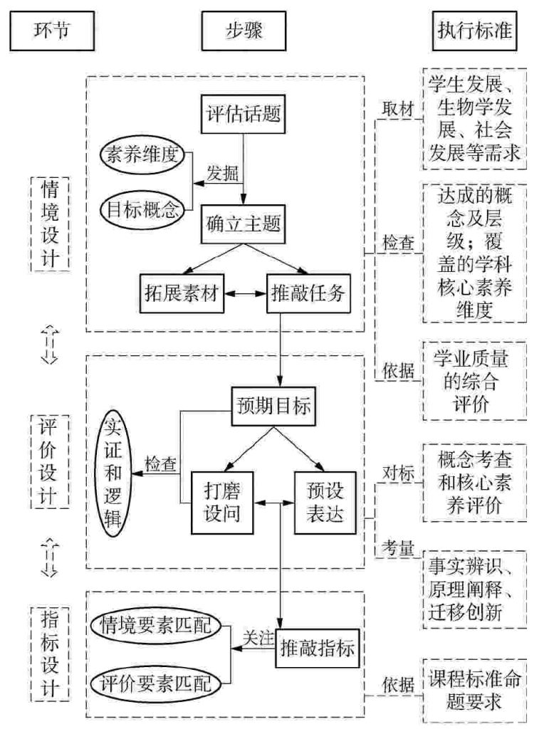 命题框架图是规范命题过程的操作指南,包含命题的流程和依据,其功能是保障试题命制过程系统化和标准化实施。基于上文对试题要素表的模块设定,命题流程呈“情境—评价—指标”设计三段式(图1)。三阶段非线性排序,而是动态循环实施,在执行标准的约束下协调试题各要素的匹配,保障试题情境、设问和立意一致指向课程标准命题要求。