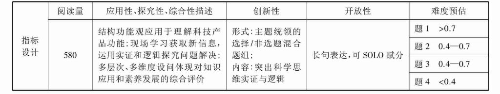 试题的指标设计是协同情境和评价设计不断精细化的过程。重点关注①“主题-任务-素材”匹配度检查:即主题能否涵盖并支撑任务与素材;三要素构建的试题情境能否支撑核心素养的测评;②“目标-设问-表达”一致性检查:即,答题表现的开放度和层次化能否达成评价立意。通过以上检查,不断打磨试题的质性品质,并决定试题的难度和区分度,最终对试卷创新性产生影响。