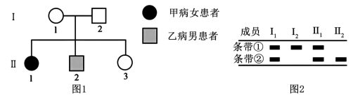 2.已知甲、乙遗传病分别由等位基因A/a和B/b控制(其中一种病的遗传方式为伴性遗传)。图1表示某家系中有关甲病和乙病的遗传系谱图;图2表示该家系部分成员与上述乙病有关基因的电泳结果(每种基因电泳后出现1个条带,且不同基因的电泳条带不同。例如,基因型为Bb的个体的基因电泳后显示2个不同的条带)。不考虑基因突变和染色体变异的发生,下列叙述错误的是( )
