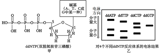 4.Sanger双脱氧链终止法是DNA测序的一种基本方法,双脱氧核苷三磷酸(如图甲)在人工合成DNA体系中,可脱去两个磷酸基团形成双脱氧核苷酸并释放能量,双脱氧核苷酸可使DNA子链延伸终止。在人工合成DNA体系中,有适量某单链模板、某一种双脱氧核苷三磷酸(ddNTP)和四种正常脱氧核苷三磷酸(dNTP),反应终止时对合成的不同长度子链进行电泳(结果如图乙)。下列说法错误的是( )