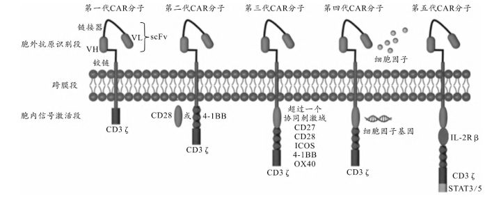 图2第一代至第五代CAR分子的结构特征(改自潘心怡等)