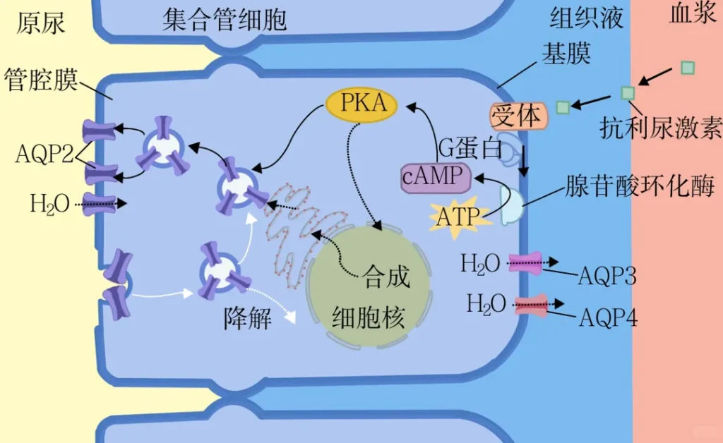 此时,肾小管和集合管上皮细胞对水的通透性显著增加,在肾髓质渗透压梯度的作用下,管腔中的水分通过水通道蛋白重吸收进入血液,实现尿液浓缩,减少尿量,从而保留体内水分,维持血浆渗透压和血容量稳定。此外,抗利尿激素还可通过V1受体收缩血管,辅助升高血压。