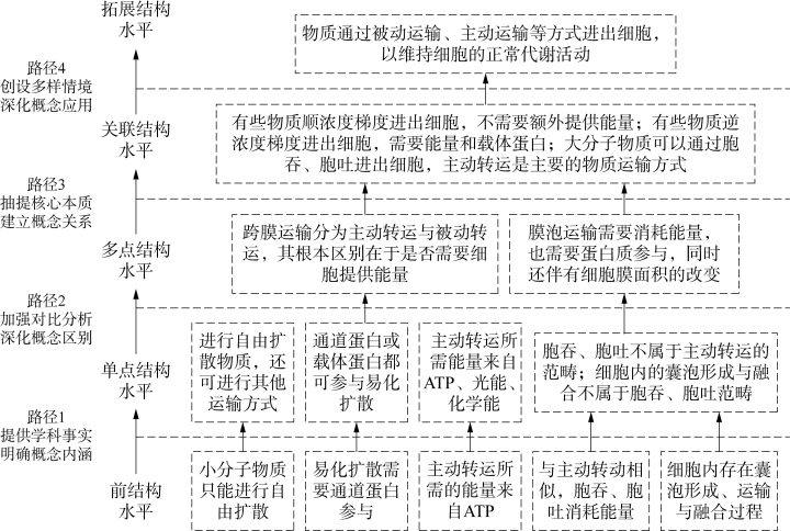 | 关联结构水平 | 水平3 | 推导事物本质特征的定量关系,或者通过定量实验验证定量关系;能借助数学表达式、图像等表征概念 | 运用结构与功能观比较分析多种转运方式的异同;阐述主动转运是物质出入细胞主要方式的原因和意义; |