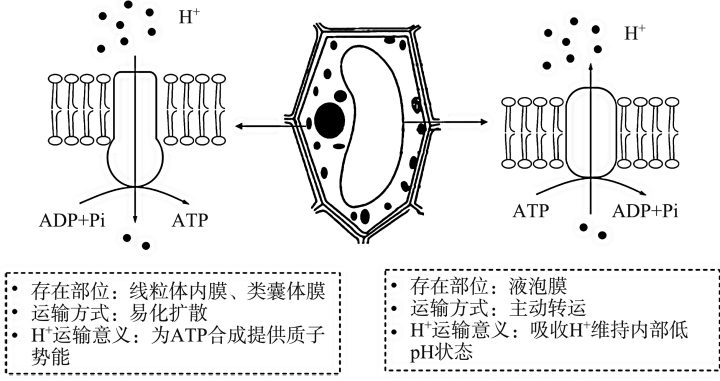 图4 H+借助主动转运和易化扩散进行运输