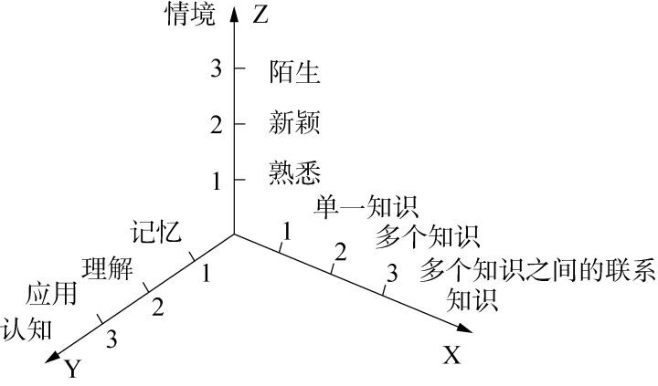 根据上述的成就水平划分表,进一步设计“SOLO层级—四翼—三维度”评价模型(表3),各层级的评价特征及要求见表3。在该评价模型中,情境问题链的设计需合理地把控难度与梯度。问题的难度与梯度由知识点涵盖的数量、情境的新颖性和学生的认知程度决定,设计问题时,需综合考虑X、 Y、 Z 3个维度(图7)。当坐标的数字越大,情境越新颖和陌生,呈现的问题就越难,解答该情境问题所涉及的知识点越多,学生的认知水平越高。