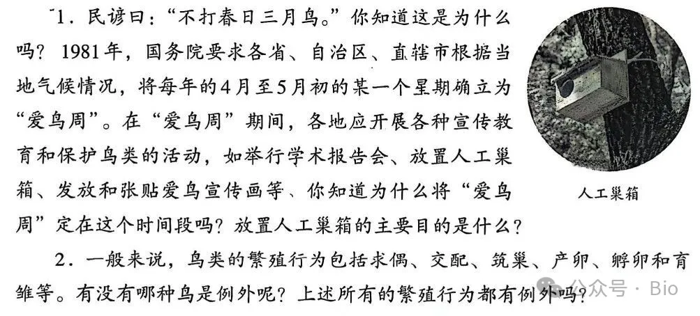 教材中,“鸟类的生殖和发育”隶属于“动物的有性生殖”这一章节——鸟类通过雌雄交配,产生受精卵,再通过筑巢、孵卵、育雏等行为,完成后代的培育。