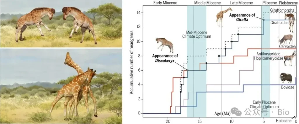 1700 万年前的早期长颈鹿类化石Discokeryx xiezhi显示,其脖子短、粗、加固,头骨配备撞击结构,完全为格斗设计,与取食无关。现代观测也证实: