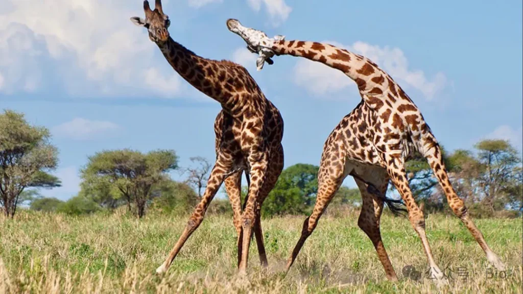 - 雄性长颈鹿会通过necking(颈击)争夺配偶,颈长、颈粗直接决定争斗胜负,胜者拥有更高交配权;