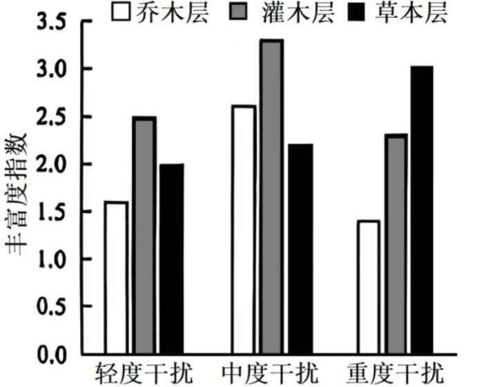 中度干扰时,各层物种丰富度均上升。