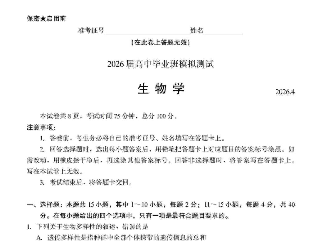 厦门市2026届高三毕业班第二次质量检测 生物学