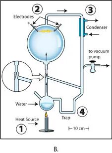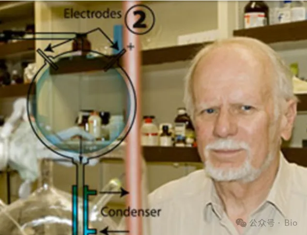 1953年,美国科学家米勒模拟原始地球的条件,将甲烷、氨气、氢气和水蒸气放入密闭装置,通过火花放电模拟闪电。一周后,装置中产生了多种氨基酸。